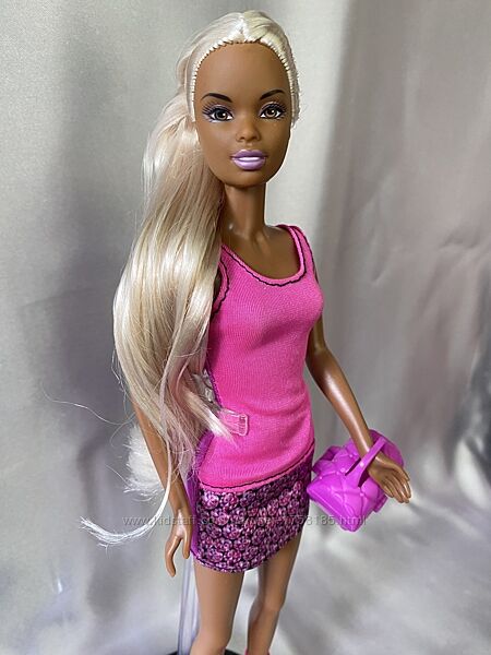 Рівна, гарненька голівка з молдом Аша, яку дуже прискіпливо вибирала колись на китайському сайті. Більше таких не бачила, і що саме це був за випуск Mattel не знаю. Дуже сподобався макіяж і вираз обличчя , тримала на кастомізацію, все не вистачало на неї часу і місця. Прошита не надто густо на потилиці, проте в зачісці - не особливо видно. Матеріал волосся дещо жорсткий, але не пухнатиться, що добре. Посаджена на тіло від Defa Lucy, що підійшло по скінтону. Одягнена, взута, має сумочку. Можна з нею добре погратись і підібрати інші образи - має хороший потенціал і незвичне поєднання платини волосся і такої інтенсивної смуглості. Дуже примітна Аша з колекційним розміром голови.Продається в цьому образі.