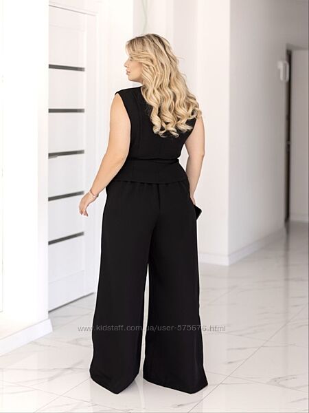 Жіночний, елегантний і сучасний костюм, чудово підійде для ділової зустрічі чи стильного вечірнього виходу.Штани з високою талією та широкими штанинами, що створюють легкий і комфортний силует.