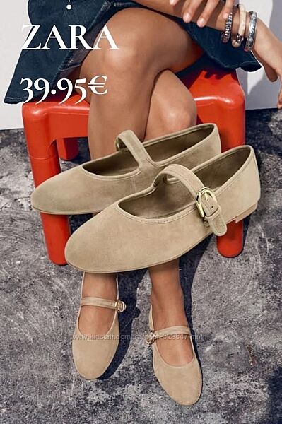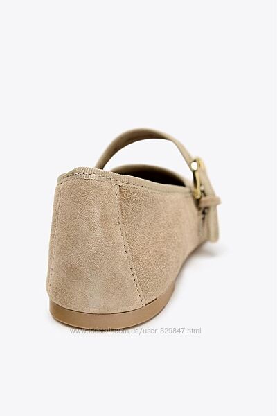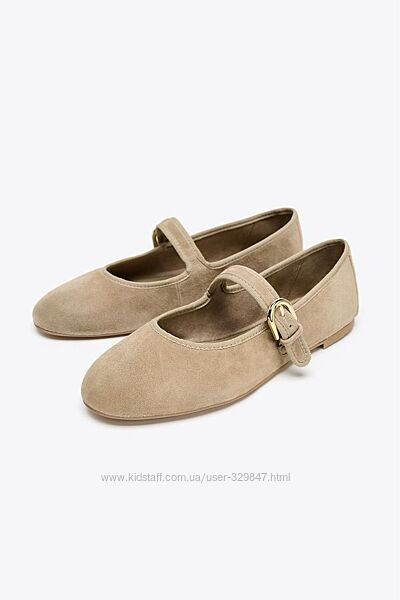 ZARA.НАЯВНІСТЬ.Низькі балерини із замші. 100% шкіра..Передній ремінець з регульованою металевою пряжкою. Детальна обробка з контрастних матеріалів. Із заокругленим носком.