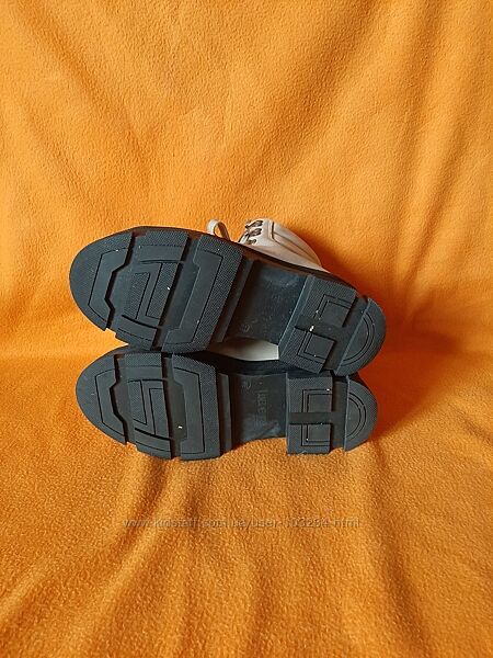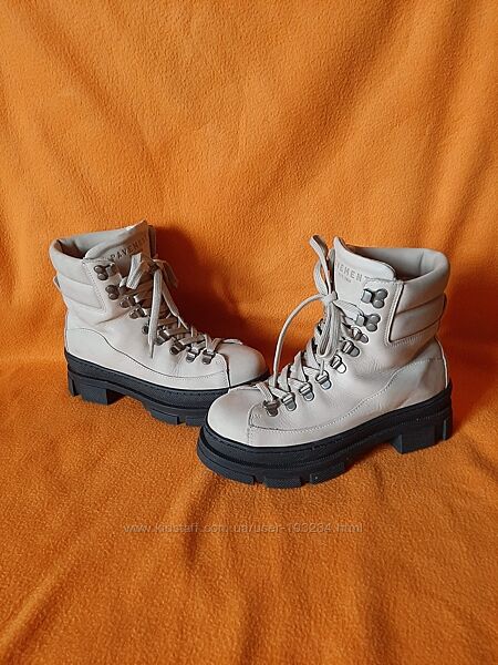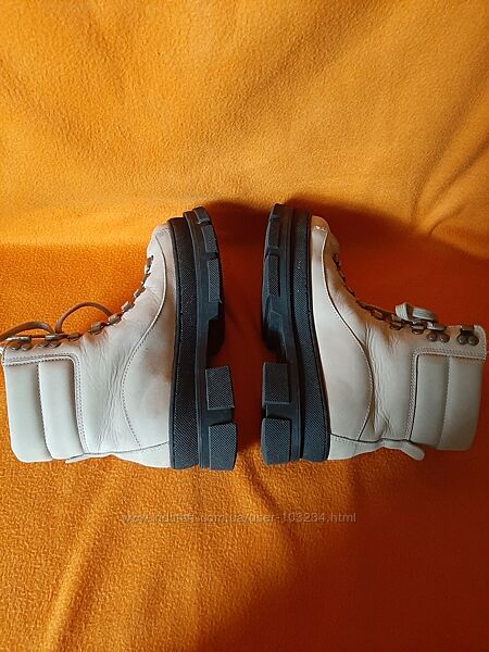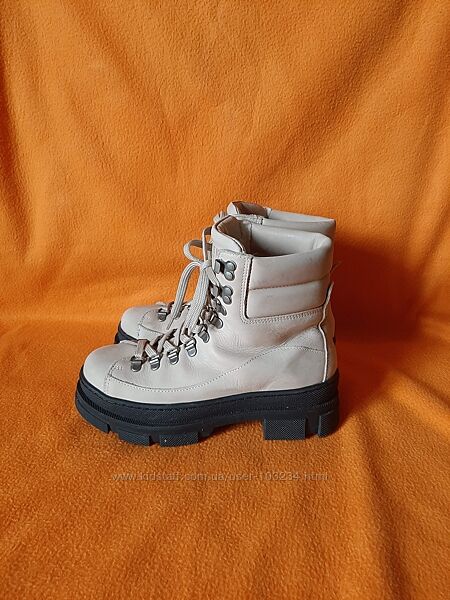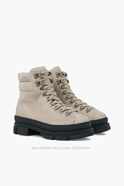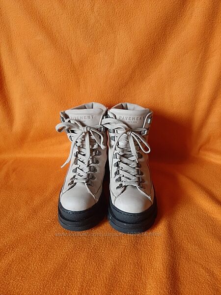 Масивні шкіряні черевики Pavement зі світлого нубуку з чудовою підкладкою зі 100% зігріваючої вовни. Взуття має відповідну шнурівку та середню високу халяву для комфорту та посадки, водночас захищаючи ваші ноги від бруду та снігу. Взуття має округлий носок і товсту грубу гумову підошву, яка добре зчіплюється з поверхнею. Нормальний розмір.