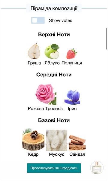 Аромат належить до фруктово-квіткової родини з деревними акцентами, поєднуючи молекулярну парфумерію з емоційною глибиною. Парфум відкривається соковитим фруктовим вибухом — груша додає свіжої солодкості, полуниця — ягідної ніжності, а цукатка яблука — іскристої грайливості, створюючи відчуття легкого, сонячного ранку. Квіткове серце з рожевим відтінком — рожа привносить романтичну м´якість, а ірис додає пудрової елегантності з нотками білого квіткового букета, що наповнює ароматом інтуїтивної чистоти. М´яка, спокійна основа — сандалова теплота переплітається з мускусною чуттєвістю та кедровою глибиною, створюючи оксамитовий шлейф