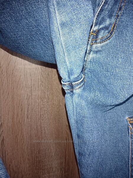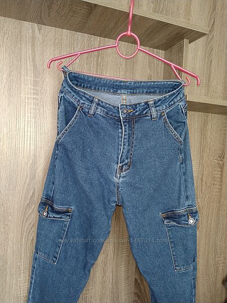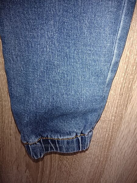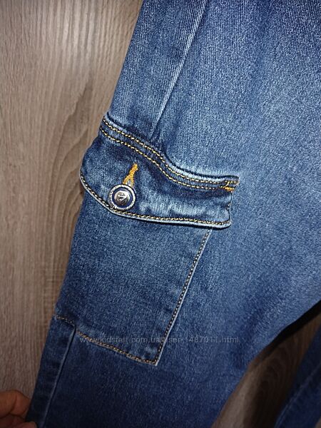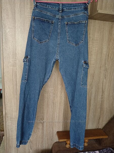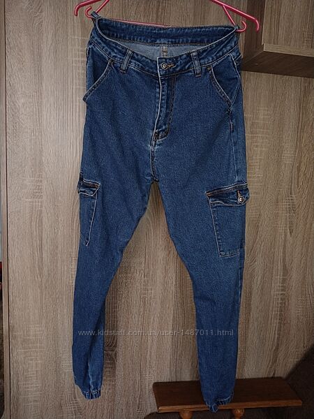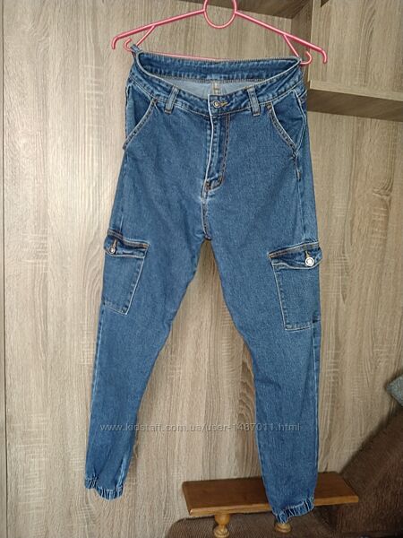 Джинсы - джоггеры Vanver женские. Размер 28 - соответствует 46 размеру. Цвет синий. Ткань плотная, чуть тянется, состав: коттон, 2% эластан. Джинсы прямые, линия талии слегка завышена, есть карманы на уровне колен, низ штанин на резинке.Длина 98см, окружность пояса 70см, окружность бёдер 100см, ширина штанин на уровне бедра 27см, в самом низу 13см. Глубина посадки: спереди - 30см, сзади - 38см.