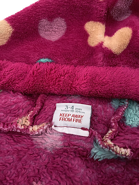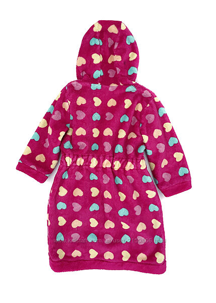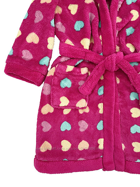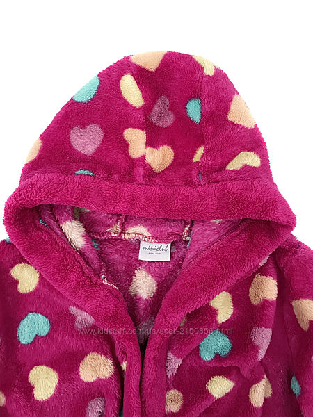 Чудовий пухнастий халатик з різнобарвними сердечками для маленької принцеси 3-4 років (зріст 98-104 см).Максимально комфортна модель із капюшоном, пояс втратити неможливо, є бічні кишені.