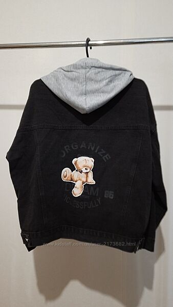 Джинсова курточка чорного кольору зі знімним сірим капюшоном. На спинці рисунок.Розмір XL