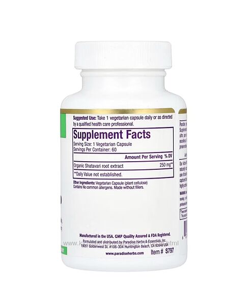 Подробное описание: Paradise Herbs, екстракт шатаварі, 60 капсул