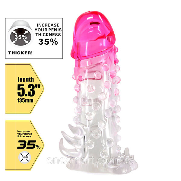 Еластична насадка на член із шипиками та додатковим стимулятором клітора – ідеальне рішення для тих, хто хоче урізноманітнити інтимне життя та посилити відчуття під час статевого акту. Ця насадка дозволяє подарувати партнерці нові яскраві враження та сприяє досягненню безлічі оргазмів завдяки рельєфній поверхні та додаткової стимуляції клітора.Виготовлена з м´якого та еластичного TPR-матеріалу, повністю безпечного для тіла та приємного на дотик. Матеріал легко розтягується по довжині та ширині, забезпечуючи щільне охоплення статевого члена, що допомагає продовжити ерекцію та посилити відчуття. Водонепроникність виробу дозволяє використовувати його у ванній або душі, а легка вага робить носіння комфортним.