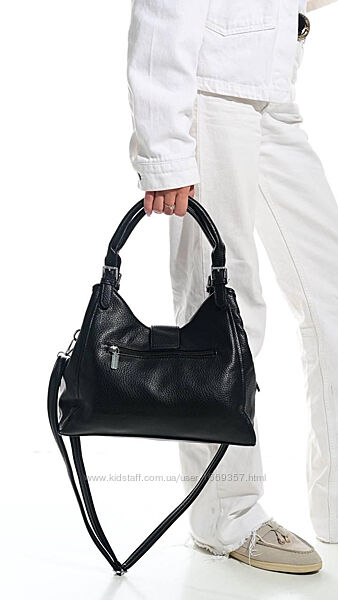 Стильна жіноча чорна сумка зі штучної шкіри - це ідеальне поєднання елегантності та зручності. Сумка має три містких відділа для зберігання необхідних речей. Усередині розташовані три кишені, одна з яких на блискавці, що дозволяє організувати простір максимально ефективно. Додатково є кишеня на блискавці на задній частині сумки, що забезпечує швидкий доступ до дрібниць.