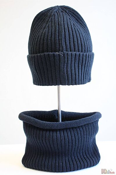 Комплект для хлопчика складається з однотонної шапки та снуда, виготовлених з м'якого матеріалу.