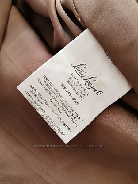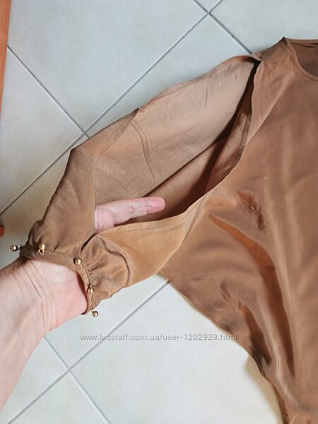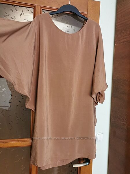 Шикарна, оригінальна італійська сукня з шовку, Luisa Spagnoli, розмір S-M, в гарному стані, одягнута один раз. Є трішки розводи, в одному місці, при носці не видно. Прати не пробувала.Довжина від плеча 90, бедра 50, груди 47. На підкладці. Зверху на рукавах розрізи.
