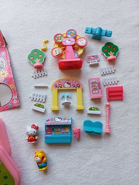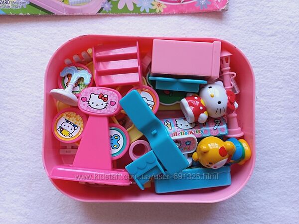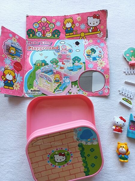 Пропоную ігровий набір міні-фігурок Hello Kitty парк . Вживаний акуратно, стан іграшки відмінний, паперова коробка на жаль облізла.Розмір пластикового короба 14х11 см.