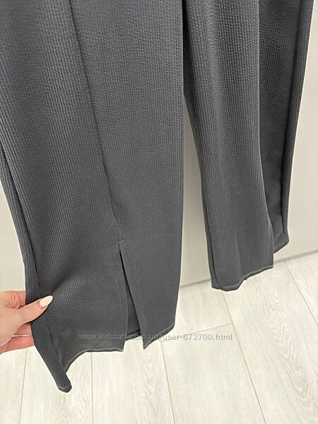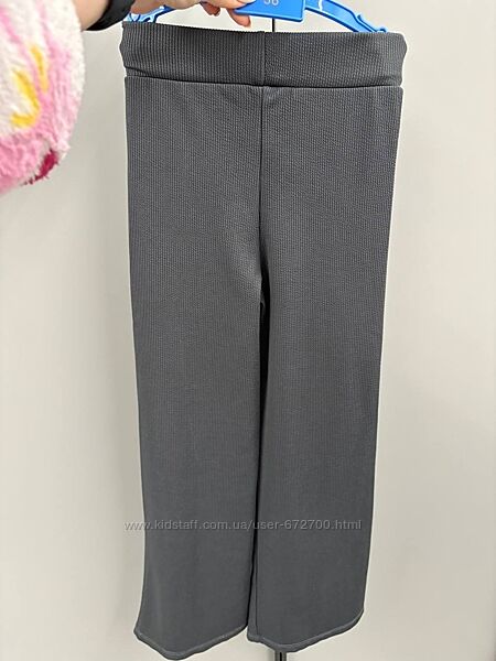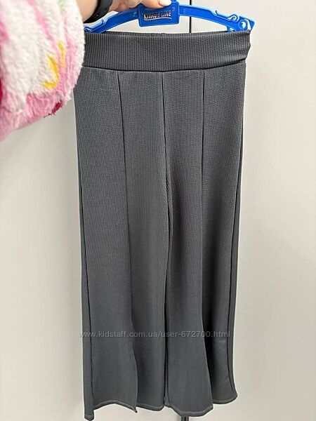 Модні штанці брюки на дівчинку кльош (116 -128 см), внизу розрізи, дуже гарно сидять, з приємної тканини, зручні та сучасні. Колір дуже гарний сірий. Стан нових. Чудово підійдуть для школи.Заміри: