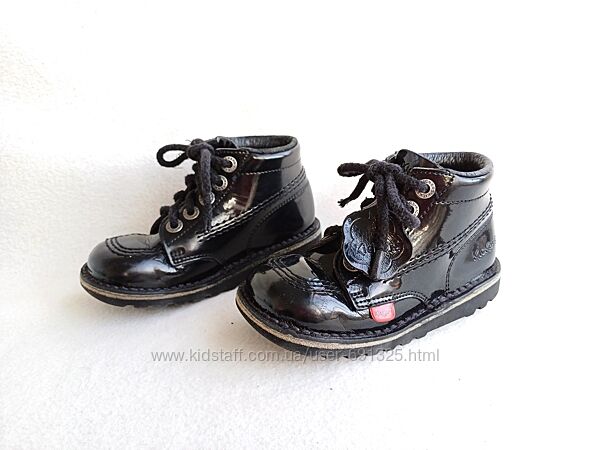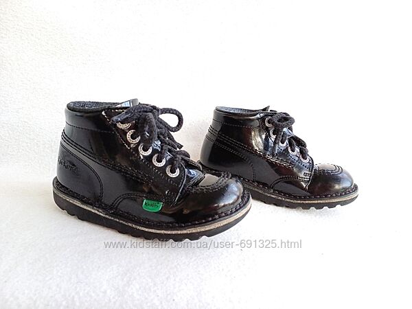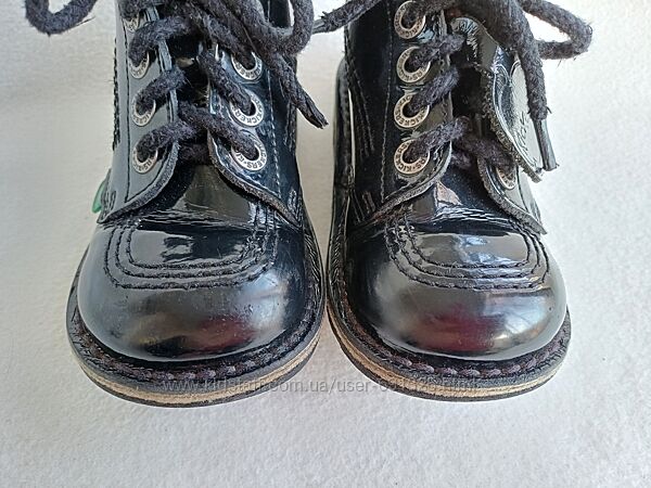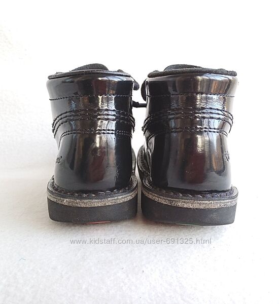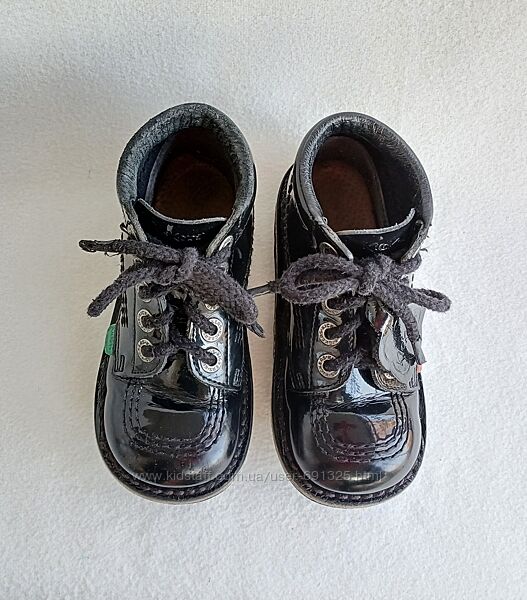 Пропоную чорні черевички з натуральної лакованої шкіри KicKers. Вживані мало, стан дуже добрий, трохи подряпані носочки, дивіться фото.Розмір вказаний 27, довжина устілки всередині 17 см.