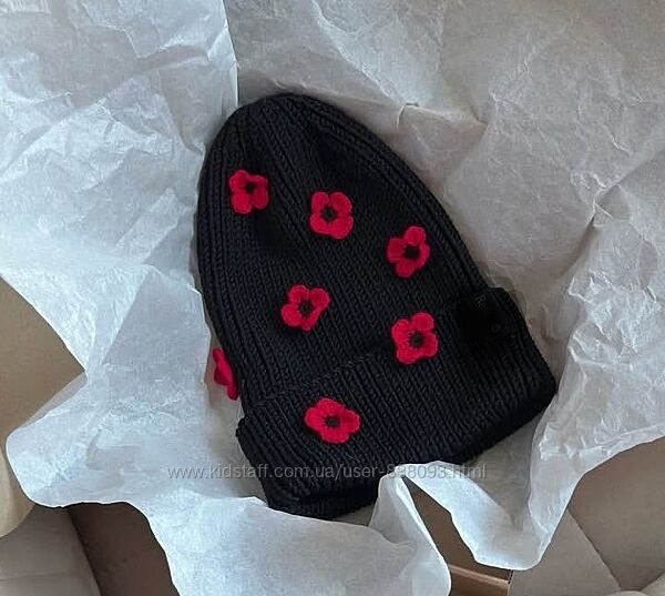 Мериносова шапочка з квіткамиСтильна в’язана шапка з м’якої натуральної мериносової вовни.