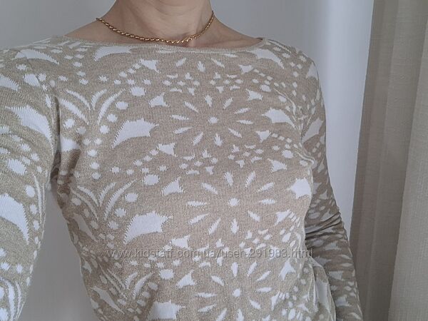 Оригінальний елегантний светр від відомого італійського бренду Pennyblack (Max Mara Group). Ця річ додасть витонченості як повсякденному, так і святковому гардеробу. Светр виконаний у вишуканій комбінації кольорів: кремово-білий на спині та попереду і рукави із золотистим/бежевим мерехтливим візерунком (жакардове плетіння). Спинка має легку, ажурну в´язку (дрібна сітка), що додає свіжості та елегантності. Рукави та передня частина виконані щільнішою в´язкою з контрастним квітковим орнаментом. Виріз "човник" (Boat neck) або злегка розширений округлий виріз, що візуально подовжує шию. На спині розташовані три мініатюрні ґудзики, які слугують як декоративним, так і функціональним елементом. Стан: Б/в, чудовий стан (за винятком зрізаної бірки). ! Зверніть увагу: Бірка зі складом та розміром зрізана. Судячи з зовнішнього вигляду та блиску, у складі присутня віскоза/бавовна (для м´якості) та металізована нитка (для золотистого мерехтіння). Заміри (розмір підходить на S/M, орієнтуйтеся по замірах): довжина 56 см, рукав 59 см, плечі 37 см, від пахви до пахви 43 см. Светр ідеально поєднується з однотонними спідницями (особливо плісе), класичними брюками (як на фото, синіми або чорними), а також підійде під джинси для шикарного кежуал-образу. Не пропустіть можливість придбати якісну дизайнерську річ за привабливою ціною! Без повернення