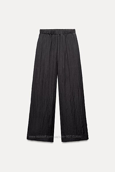 - Штани з високою посадкою із жатої тканини. Еластичний пояс, передні кишені. Широкі штанини.