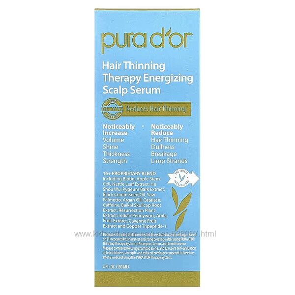 * Уменьшает выпадение волос и увеличивает их объём за счёт уменьшения ломкости. На основании: 1) многократных осмотров расчёски и подсчёте сломанных волос после использования системы против выпадения волос PURA D´OR, состоящей из шампуня, сыворотки и кондиционера или маски, по сравнению с использованием только шампуня, и (2) пользовательской оценки густоты волос, их прочности и снижения ломкости по сравнению с исходным состоянием после 8 недель использования целебной системы PURA D´OR.