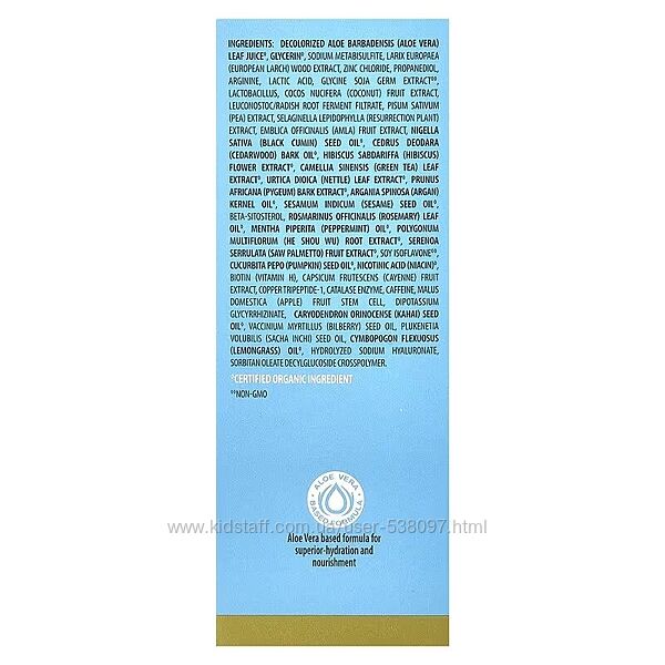 Обесцвеченный сок из листьев алоэ вера (Aloe barbadensis)*, глицерин*, метабисульфит натрия, экстракт древесины лиственницы европейской (Larix europaea), хлорид цинка, пропандиол, аргинин, молочная кислота, экстракт ростков сои**, лактобактерии (Lactobacillus), экстракт кокоса (Cocos nucifera), лейконосток/ферментированный фильтрат корня редиса, экстракт гороха (Pisum sativum), экстракт плауна чешуелистного (Selaginella lepidophylla), экстракт плодов амлы (Emblica officinalis), масло из семян чёрного тмина (Nigella sativa)*, масло из коры кедра (Cedrus deodara)*, экстракт цветков гибискуса (Hibiscus sabdariffa)*, экстракт листьев зелёного чая (Camellia sinensis)*, экстракт листьев крапивы двудомной (Urtica dioica)*, экстракт коры сливы африканской (Pygeum)*, масло из ядер арганы (Argania spinosa)*, кунжутное масло (Sesamum indicum)*, бета-ситостерол, масло из листьев розмарина (Rosmarinus officinalis)*, масло перечной мяты (Mentha piperita)*, экстракт корня горца многоцветкового (Polygonum multiflorum)*, экстракт плодов серенои (Serenoa serrulata)*, изофлавон сои**, масло из семян тыквы (Cucurbita pepo)*, никотиновая кислота (ниацин)*, биотин (витамин H), экстракт плодов кайенского перца (Capsicum frutescens), меди трипептид-1, фермент каталаза, кофеин, стволовые клетки плодов яблони (Malus domestica), дикалия глицирризинат, масло из емян кариодендрона (Caryodendron orinocense)*, масло из семян черники (Vaccinium myrtillus), масло из семян инка инчи (Plukenetia volubilis), масло лемонграсса (Cymbopogon flexuosus)*, гидролизованный гиалуронат натрия, кроссполимер децил глюкозида и сорбитанолеата.