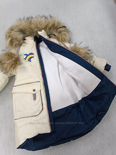 Матеріал:тканина - високоякісна плащова тканина вітронепроникна і вітронепродувна , світловідбиваючі елементи , підкладка -фліс, наповнювач силиконизированое волокно , опушення штучна знімна , вид застібки - блискавка + липучка на планці вгорі, в рукаві довяз