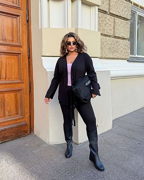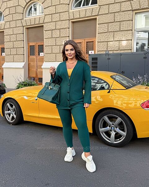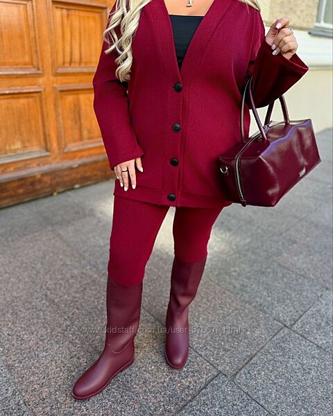 Осінній прогулянковий костюм. Кофта+ Лосини. Кофта подовження на функціональних гудзиках, з довгим пукавом. Лосини без кишень на поясі гумка. Тканина трикотаж махра рубчик. Тканина м´яка, дуже приємна до тіла, добре тягнеться. Склад: Поліестер - 35%, Бавовна - 65%. Колір: Чорний, Вишня, Смарагд, Шоколад. Розміри 50-52, 54-56, 58-60Ціна 839грн