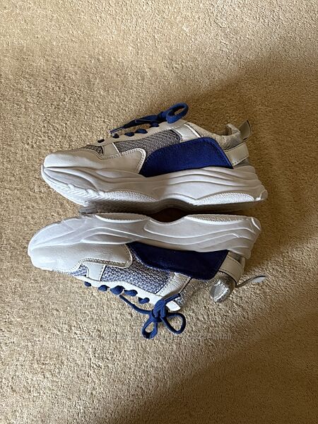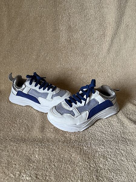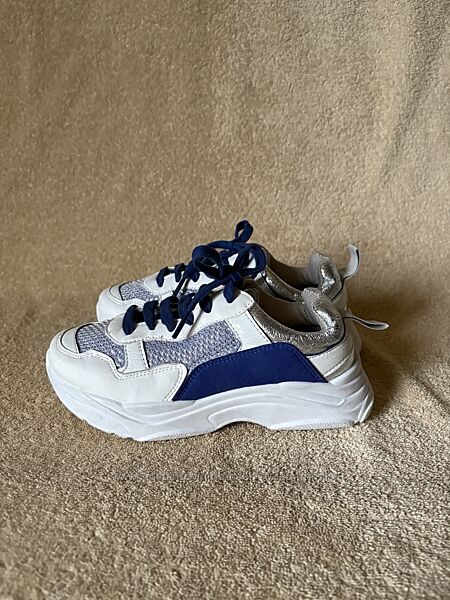 красиві, ошатні білі кросівки з еко-шкіри з синіми текстильними вставками на високій підошві. Відмінно доповнять образ як в спортивному стилі, з джинсами або спортивними штанами, так і більш класичний, з брюками