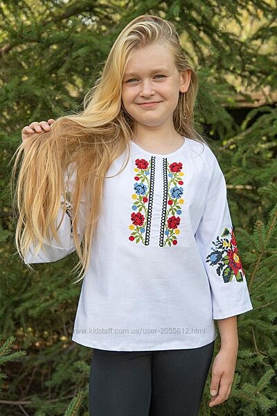 Блузка білого кольору для дівчаток прикрашена різнокольоровою вишивкою. Крій прямий. Виріз круглий. Рукав три чверті вишитий.Ціна залежить від розміру