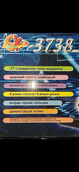 Дитячий синтезатор, піаніно фірми Metr plus. Мікрофон не працює, потрібно з´єднати кабель. Позаду є тріщина (фото 2). Характеристики:44 клавіші Зовнішній динамік Мікрофон працює від постійного/змінного струму Раціональна програма контролю матриці 27 стандартних тонів акордеону 21 демо мелодія 8 різних голосів/8 різних ритмів Широкий спектр комбінацій Функція караоке Демонстрація пісень Акорди одним пальцем Багатофункціональний синтезатор із мікрофоном Можливість запису композицій. Розмір: 75х21,5х6,5 см. Тип живлення: 6 батарейок типу AA 1,5V (до комплекту не входять) або від мережі 220V. Комплектація: піаніно, мікрофон, адаптер