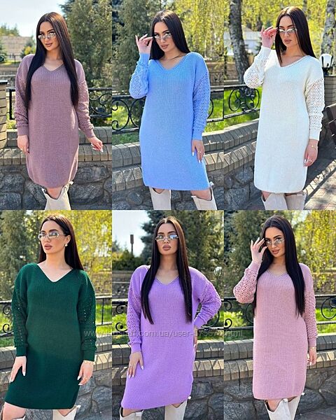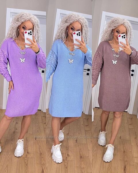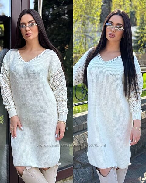 В’язана сукня комфортного вільного крою з акцентними ажурними рукавами. Стильний V-подібний виріз додає жіночності, а універсальна довжина робить річ практичною як для повсякденного образу, так і для святкових виходів.