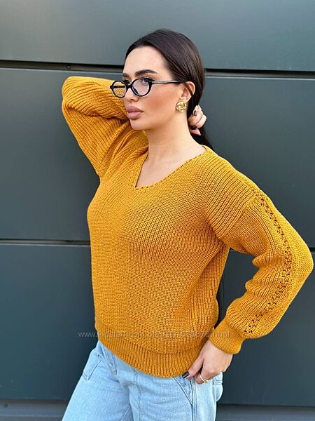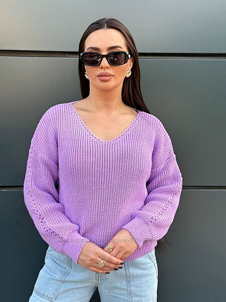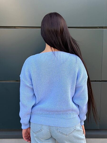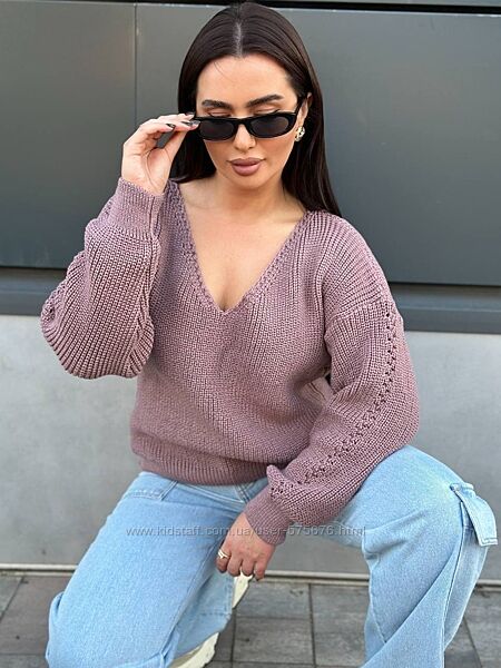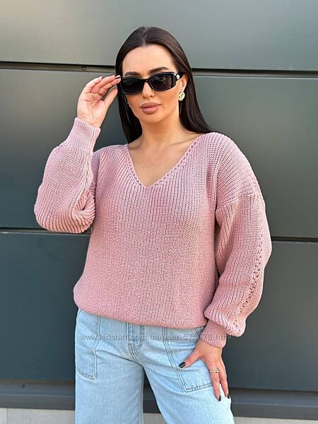 Ніжний, легкий та водночас теплий светрик з глибоким V-подібним вирізом. Виготовлений із м’якої пряжі, приємний до тіла та не колеться. Має вільний силует і спущену лінію плеча, що додає образу невимушеності та комфорту.