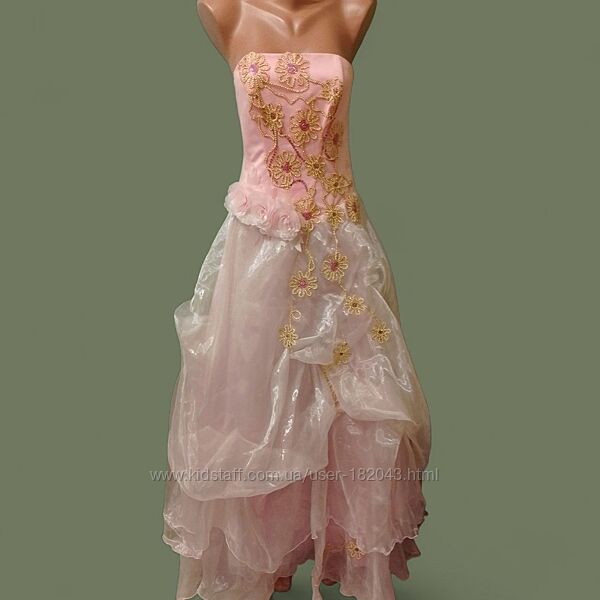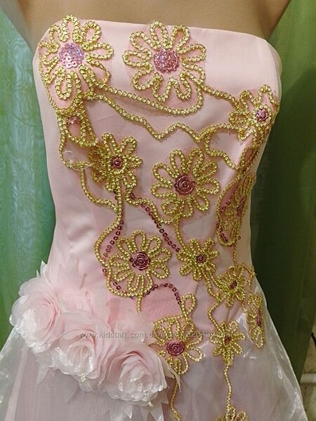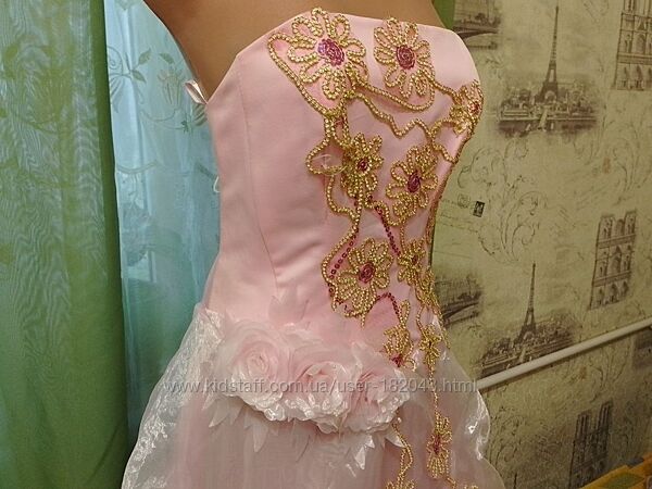Бальное платье, нежно розового цвета. Состоние идеальное. Трехслойная юбка. Нижняя подкладочная ткань, потом жесткий фатин и сверху органза. Застегивается на молнию и шнуровку. Не тянется. ПОГ 40 см, ПОТ 38-39 см, длина от подмышек 137 см.Органза спереди просто зацепленна фалдами, можно легко отцепить будет сплошная юбка.Другие объявления продавца