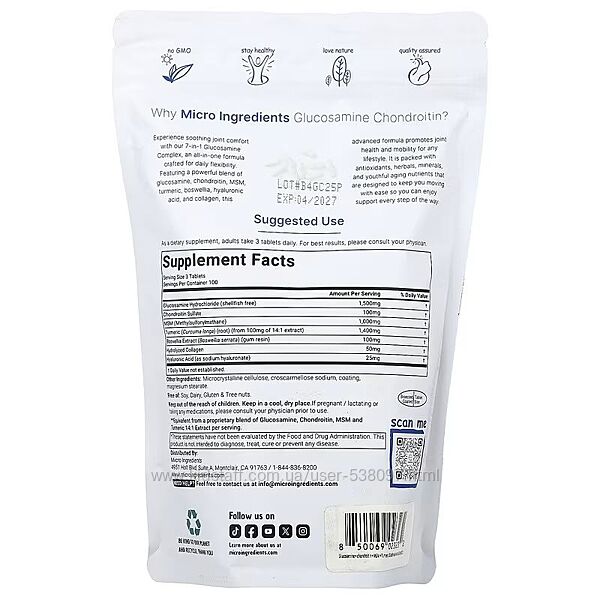 Подробное описание: Micro Ingredients глюкозамин и хондроитин, МСМ и куркума. 300 таблеток