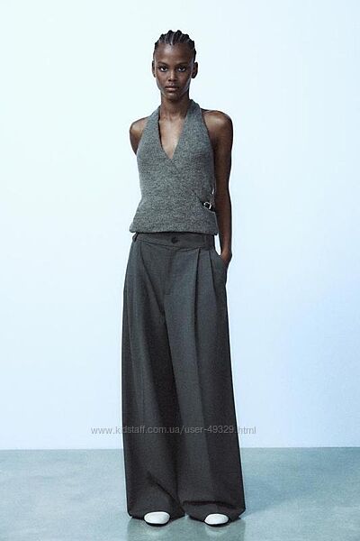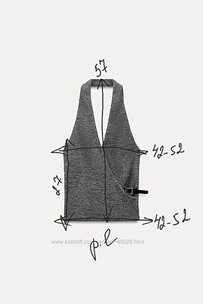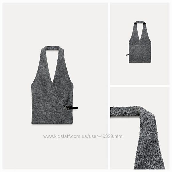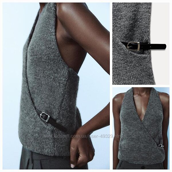 Жилет, топ Zara з 10% вовни. Дуже оригінальна і якісна річ. Хальтерний комір та V-подібний виріз на запах. Хлястик з контрастною металевоюпряжкою. Можна вдягати як на голе тіло, так і на футболку, сорочку.