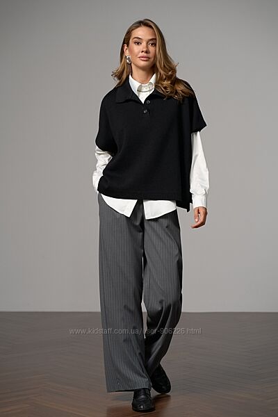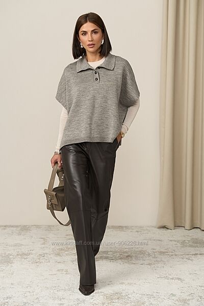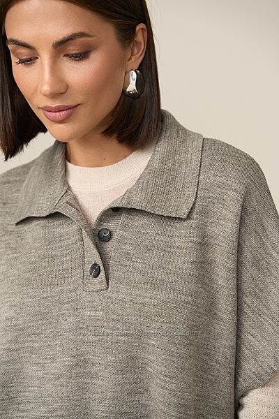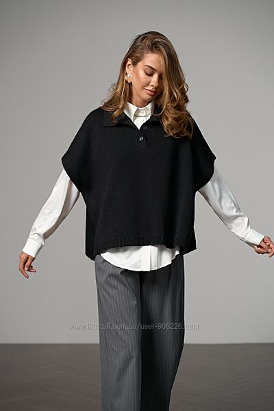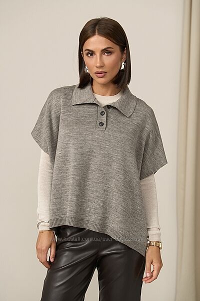 Затишне напіввовняне пончо вільного силуету виконане щільною в’язкою, приємне до тіла. Комірець поло та бокові розрізи додають елегантності.Довжина 61 - 76 см (+- 2 см).