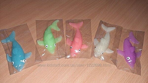 Лізун Дельфін. Дитячі силіконові іграшки зроблені у вигляді лізунов у формі дельфінів. Основу лизуна становить кольоровий прозорий силікон. Кожен лизун дельфін запечатаний в індивідуальну упаковку. Довжина іграшки лизуна Дельфін становить 14 см.Фото 3.Ціна 24 гривні один.