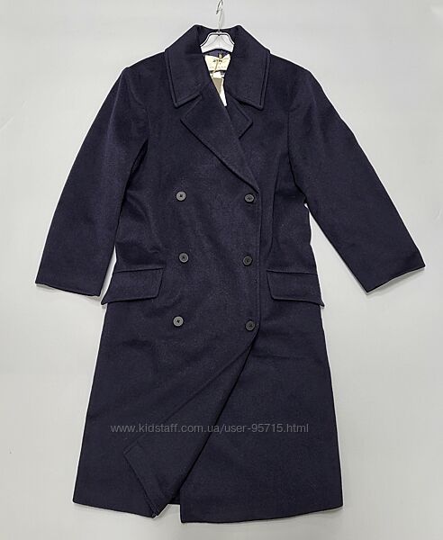 Довге пальто з коміром-лацканом і довгими рукавами. Спереду прорізні кишені з клапанами та нагрудна прорізна кишеня. Двобортна застібка на ґудзики спереду.