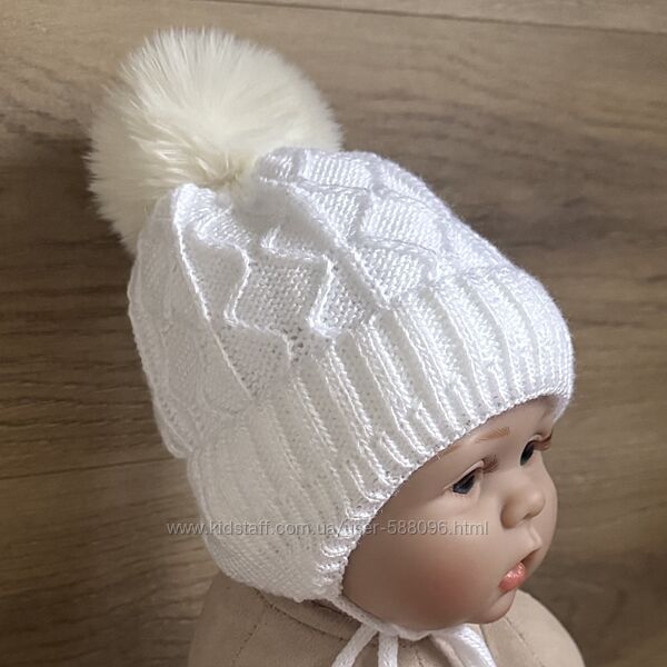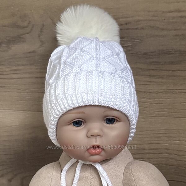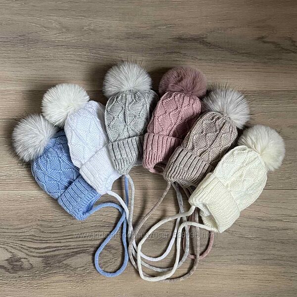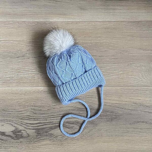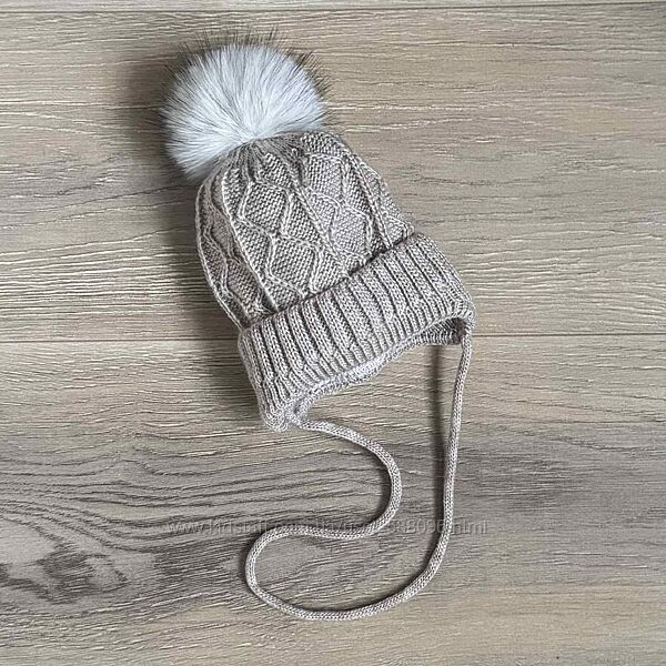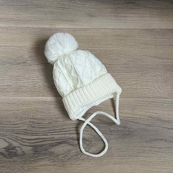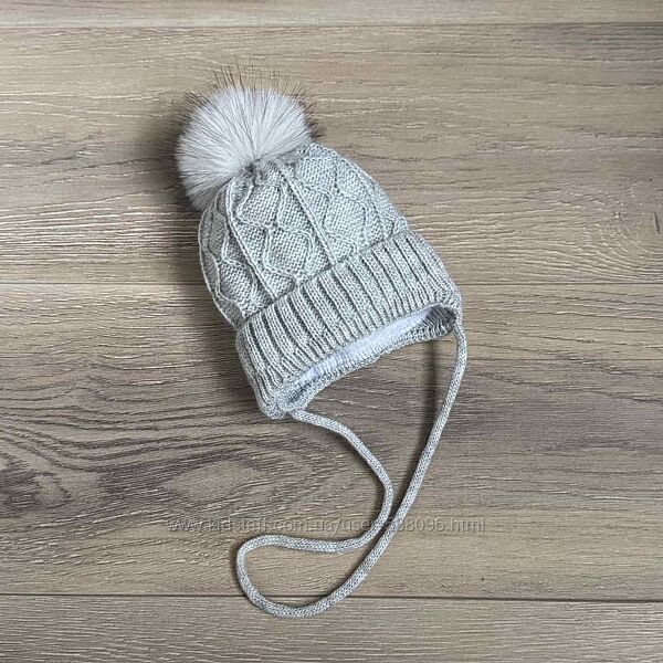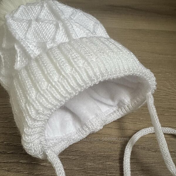В´язана зимова шапочка з бомбоном на зав´язках для новонароджених. Шапочка на флісовій підкладці.на об´єм голови 36-38