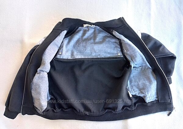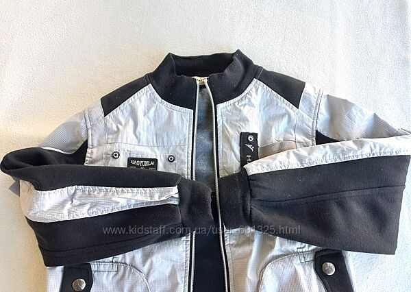 Пропоную сіро-чорну демісезонну куртку бомбер. Сіра частина - водостійка плащівка, чорна - щільний трикотаж, бавовна з віскозою. Уживана мало, акуратно, стан відмий, дивіться фото.Розмір вказано на 10 років, зріст 140 см. Довжина 55 см, ширина плечей 38 см, довжина рукава 49 см, ширина грудей під пахвами 45 см.