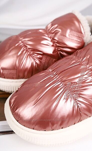 Верх виготовлений з блискучого, дутого матеріалу рожево-золотистого кольору з візерунком, що нагадує листя.Внутрішня частина взуття та верхній край оздоблені світлим штучним хутром.