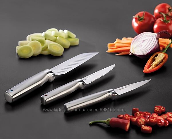Ножі оснащені технологією Elevate™ — важкі ручки з вбудованими опорами утримують леза над робочою поверхнею, запобігаючи її забрудненню. Леза виготовлені з високоякісної японської нержавіючої сталі, що забезпечує ідеальний зріз і довговічність.