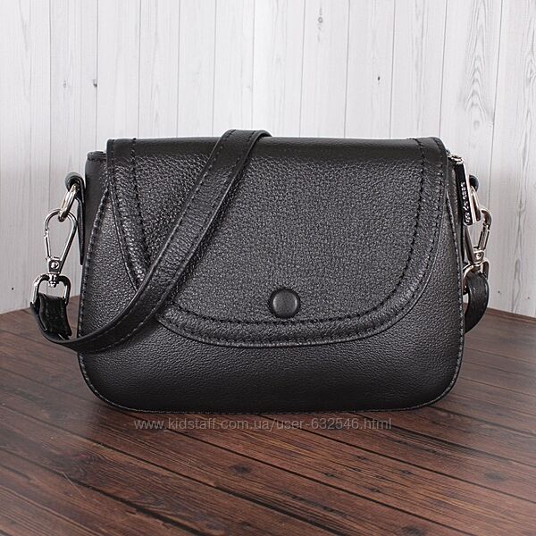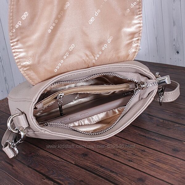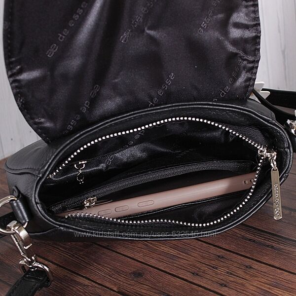 Маленька шкіряна сумочка DE ESSE. Стильна компактна модель - незамінний аксесуар на кожен день. Виріб закривається клапаном на кнопці-магніті, під яким розташована блискавка. У сумочці 2 відділення і 2 кишені всередині, а також зовнішня кишеня на блискавці. Ця модель буде гармонійно поєднуватися з повсякденним і класичним стилем. Довжина ременя регулюється. Сумочка виконана з м´якої, дуже приємної на дотик шкіри. Розмір (В*Ш) (см)14*19 Ширина дна (см)6 Висота основної ручки (см)65 Довжина основної ручки (см)130