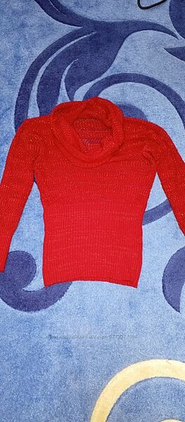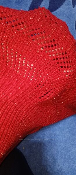 Жіночий светр яскраво червоного кольору, з люрексовою ниткою. Розмір 48-52, дуже тягнеться. На талії резинка, тому гарно її підкреслює. На вигляд светр маленький, але він на інший розмір підходить.