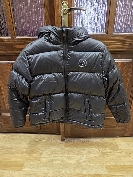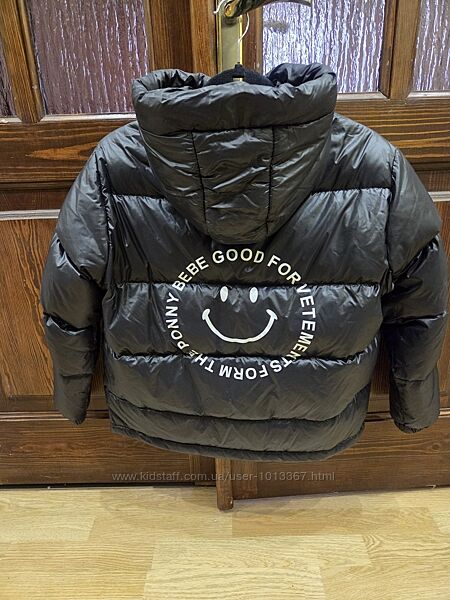 Куртка чорна осіння для дівчинки з смайликом маленьким спереду і великим на спині. Дуже гарний стан. На зріст від 140 до 152см.Заміри по виробу:довжина 57см,під руками 51см,плечі 42см, рукав 53см.