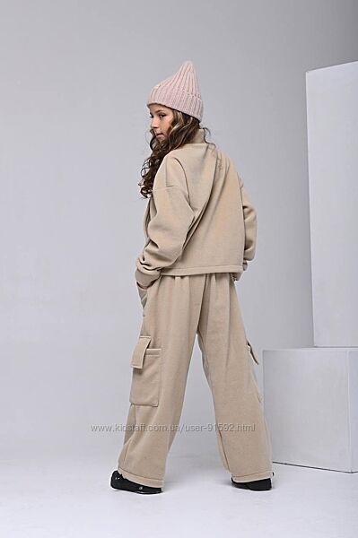 Найпопулярніший костюм сезону із ФЛІСУТканина - турецький фліс із щільним начосом. Має гарну властивість зігрівати в холодну пору при цьому бути легким, що відрізняє його від інших теплих тканин. Високої якості пошиття. Штани палаццо регулюються резинками на фіксаторах, які перетворюються в джогери. Чотири кишені додають стилю.