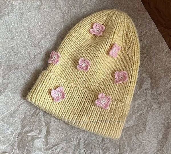 шапочка з квіткамиСтильна в’язана шапка з м’якої натуральної мериносової вовни.(Турецької)