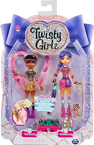 SECRET TWISTY PETZ: Twisty Girlz BFFs поставляється з надзвичайно милим таємничим вихованцем – єдинорогом, цуценям тер’єра, поні тощо! Використовуйте повідець, щоб з’єднати своїх ляльок і домашніх тварин або скрутіть тварину в блискуче кільце!
