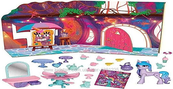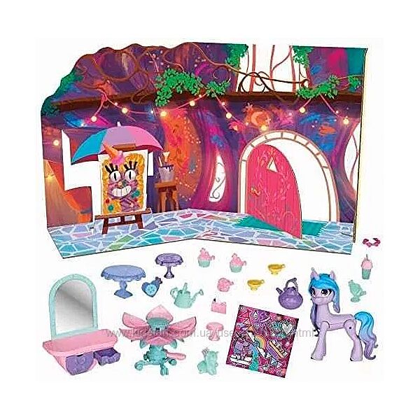 Ігровий набір My Little Pony Магічні поні MLP-Моя маленька Поні Izzy для шалених шанувальниць мультсеріалів My Little Pony.Влаштуйте чаювання з Іззі та 20 предметами, включаючи чайник, чашки, торт з єдинорогом тощо. Також є туалетний столик з ящиками, які відкриваються для зберігання. Столик у формі квітки. Натисніть на педаль копитом Іззі, щоб розкласти стіл, а потім покладіть на нього аксесуари