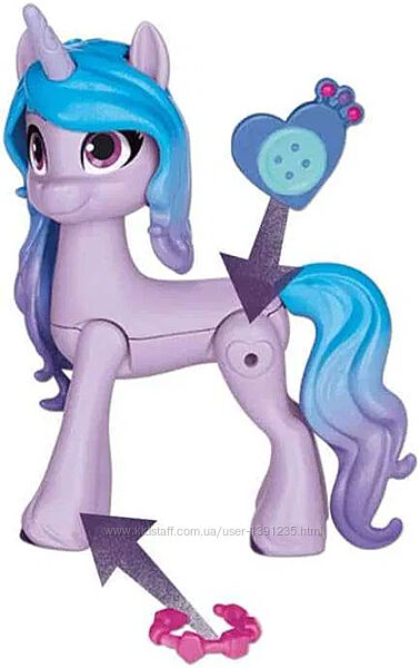 Izzy Moonbow- енергійна оптимістка, що любить блискучі речі. Має пластикову гриву та м´який хвіст, 7,6 см. Поні має гудзик у формі серця з одного боку та прикріплений знак з іншого.