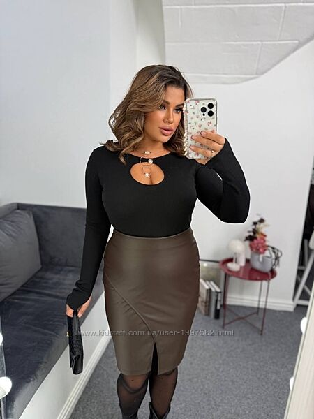 Спідниця з екошкіри на замші, попереду на запах. Позаду потайна блискавка.