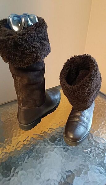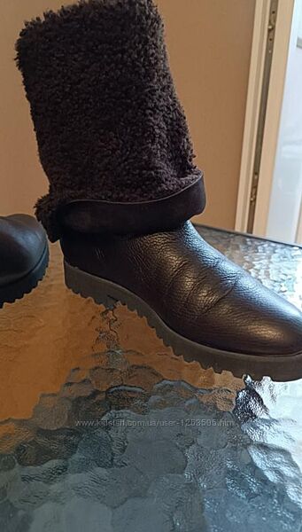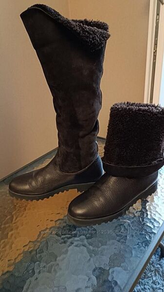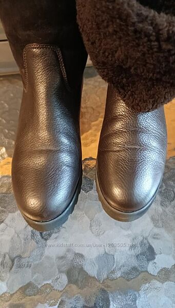 Легкі, теплі, затишні та дуже комфортні чоботи. Голівка з натуральної шкіри, висока халявка з штучної замші високої якості (на погляд не відрізняється від натуральної), хутро з овечої вовни, підошва фірмова Vibram протиковзна. Носити можно в 3х позиціях - високі, майже по коліно, середні та низькі, як ботільони.No brand, купляла в Німеччині