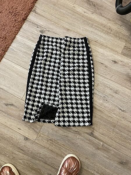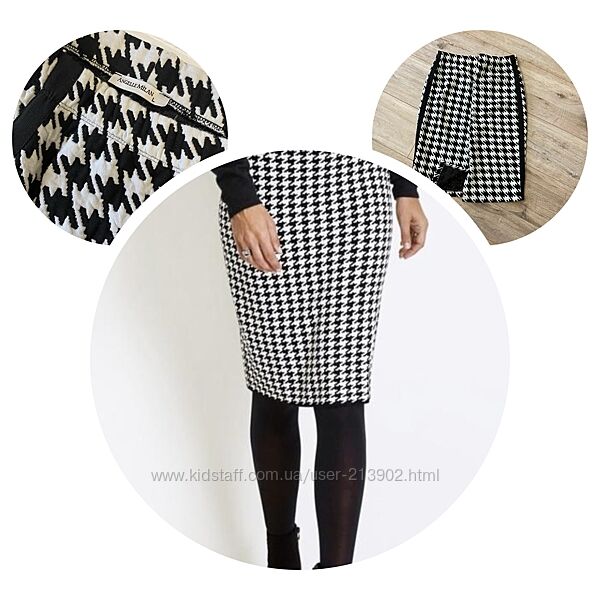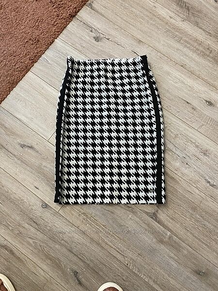 Трикотажна брендова спідниця -олівець ANGELLE MILAN в ідеальному стані.Пояс на резинці.Колір чорно-білий в принт "гусяча лапка"з чорними лампасами по боках.Розмір L заміри:довжина-58,ширина в поясі по резинці-39(45) по бедрах-50(55) Ззаді шліца висотою 14 см.