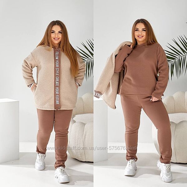 р.48 до 58р. Костюм трійка тринитка на флісі, куртка з тедді, світшот та шт